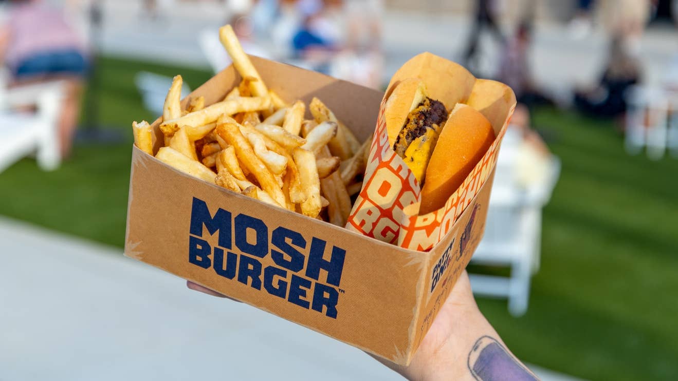 Mosh Burger brings you patties that are built to thrash. Made from 100% U.S., hormone-free beef, stacked high with melty American cheese, rich caramelized onions, and a punchy burger sauce to finish. Rock your hunger away.